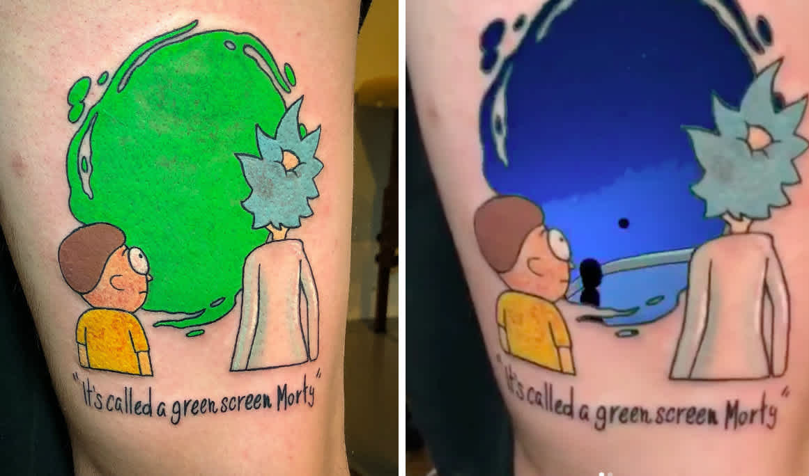 Nowthis On Twitter This Rick And Morty Green Screen Tattoo Is A Permanent Multidimensional Portal Greenscreen Tattoos Rick And Morty